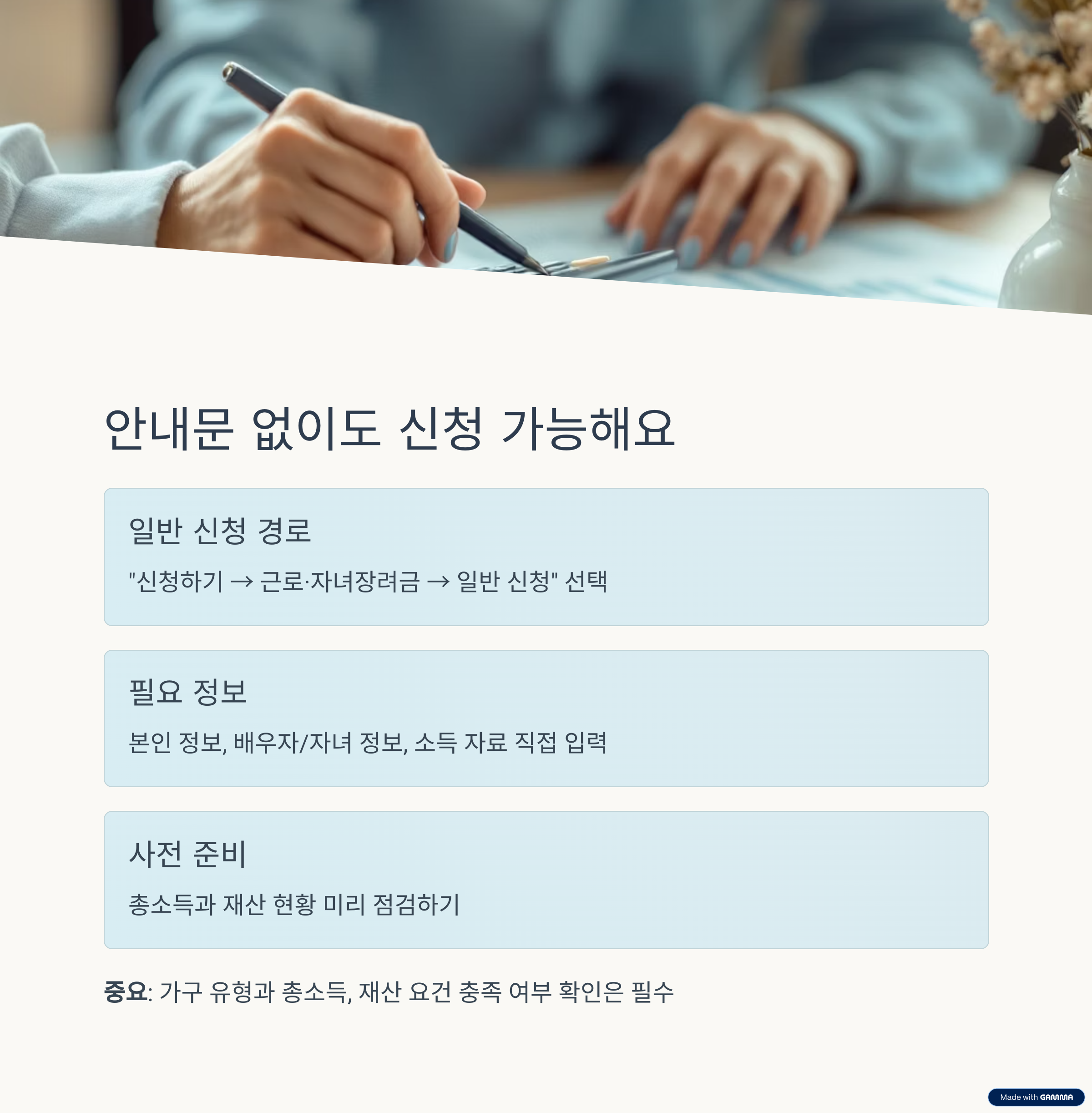 중요: 가구 유형과 총소득, 재산 요건 충족 여부 확인은 필수