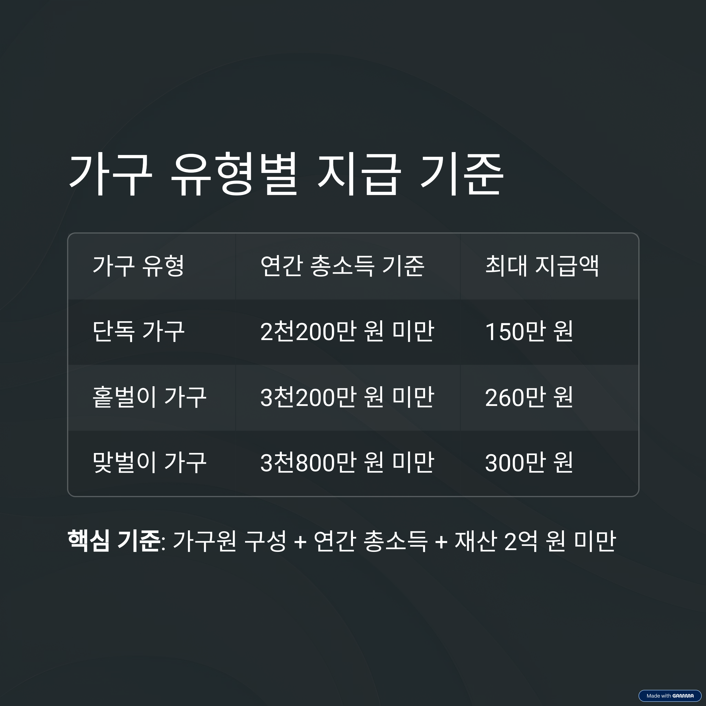핵심 기준: 가구원 구성 + 연간 총소득 + 재산 2억 원 미만