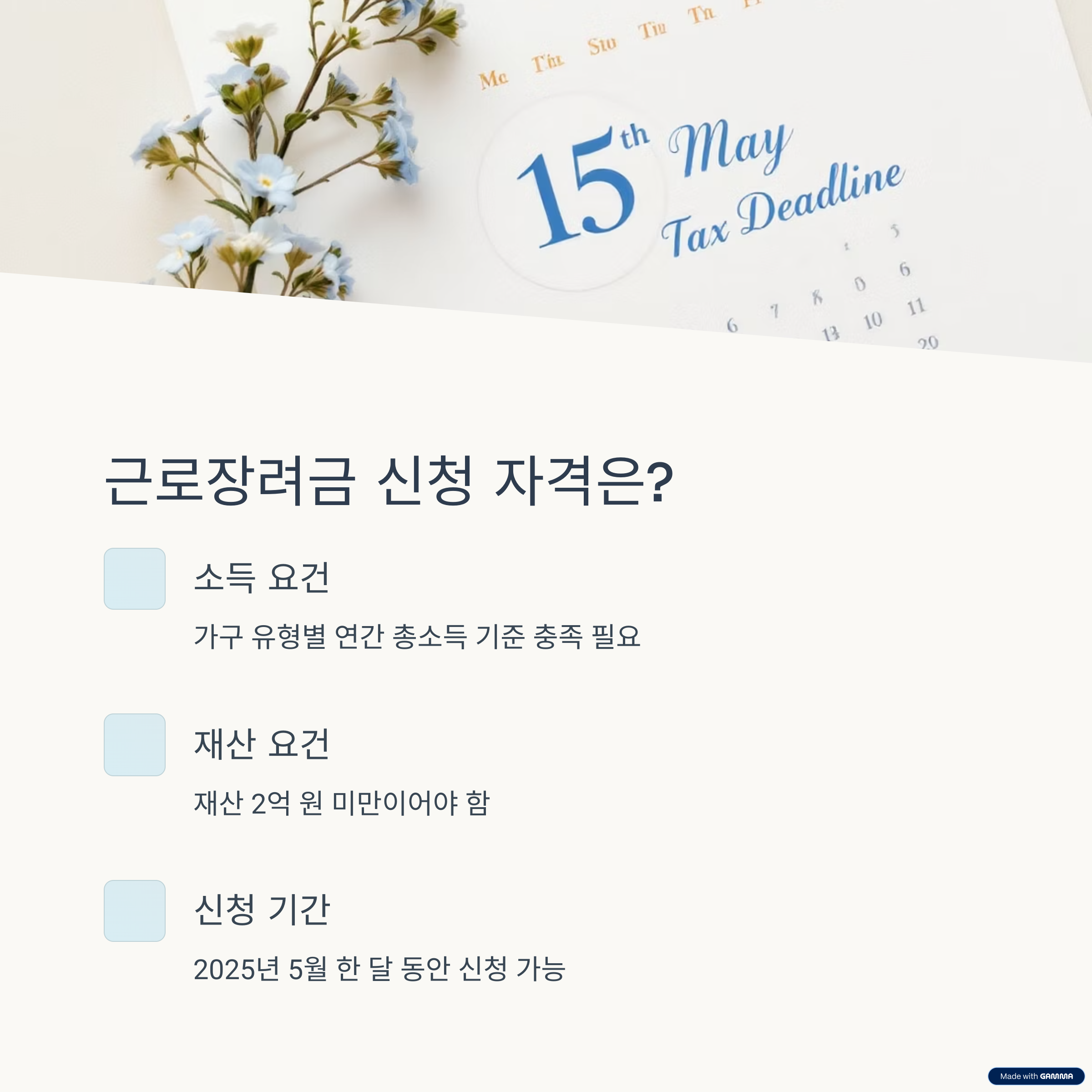 근로장려금은 소득 요건, 재산 요건, 가구 유형에 따라 신청 가능 여부가 정해집니다